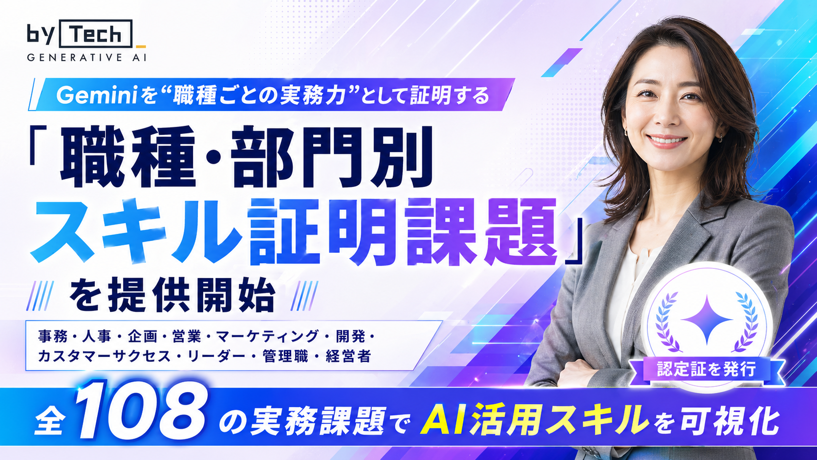 本課題は、事務職、人事職、企画職、営業職、マーケティング職、開発職、カスタマーサクセス職、リーダー・管理職、経営者といった各職種・部門に特化した全108の実務課題で構成されており、単なるAIツールの操作理解ではなく、「現場で成果につながるGemini活用力」を可視化できる実践型コンテンツです。