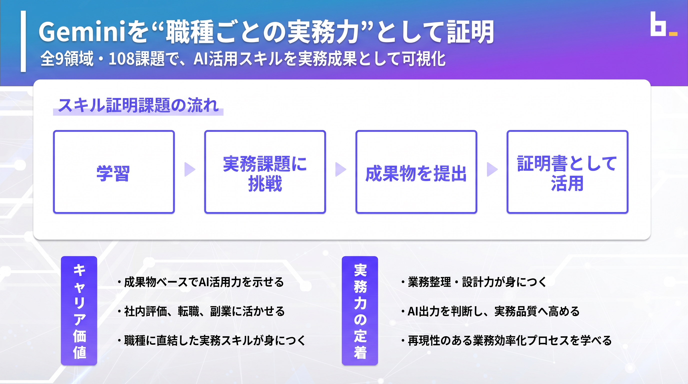 職種・部門別スキル証明課題は、「Geminiを触れるようになりたい」にとどまらず、「自分の仕事で成果につながる形で使いたい」「業務に落とし込み、周囲に説明できるレベルまで高めたい」という声をもとに生まれた実践型コンテンツです。