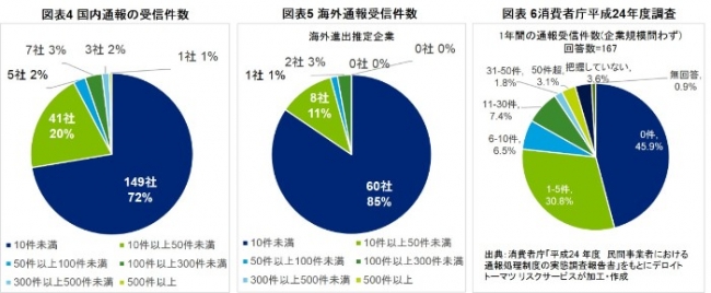 直近1年間の国内の通報受信件数は、窓口はないもしくは実績値を把握していないと回答した企業24社を除き、10件未満の企業が149社72%で最多であり(図表4)、消費者庁による「平成24年度 民間事業者における通報処理制度の実態調査報告書」で公表した値(図表6)と大きな差はなく、通報受信件数はそれほど増