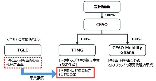 豊田通商株式会社(以下:豊田通商)は、ガーナ共和国(以下:ガーナ)において、子会社であるCFAO SAS(以下:CFAO)傘下のTOYOTA TSUSHO MANUFACTURING GHANA CO. LIMITED(以下:TTMG)が、2025年12月31日付で、TOYOTA GHANA LIMITED COMPANY(以下:TGLC)からトヨタおよび日野の代理店事業を譲り受けたことをお知らせいたします。