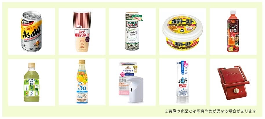 食品(肉・野菜の加工品やチーズ乳製品、冷凍食品、パン・麺・パスタ、調味料、粉類、乾物、缶詰、お菓子など)/ 飲料(水、ソフトドリンク、お茶・コーヒー、アルコール飲料など)/ キッチン用品・調理家電(電子レンジ、炊飯器、フライパン、保存容器、食器など)