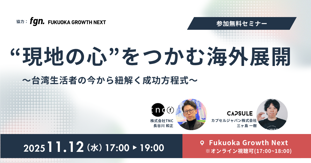 海外リサーチ・マーケティング及び商品開発・PRサポート事業を行う株式会社TNC(本社:東京都渋谷区、代表取締役社⻑ ⼩祝誉⼠夫、以下「TNC」)と、販路開拓・プロモーション支援を行うカプセルジャパン株式会社(本社:福岡県福岡市、取締役:埴渕修世、以下「CAPSULE」)は、台湾市場における日本企業の持続可能な展開を支援する協業プログラム「台湾市場進出ワンストップ支援プログラム」を開始しました。
