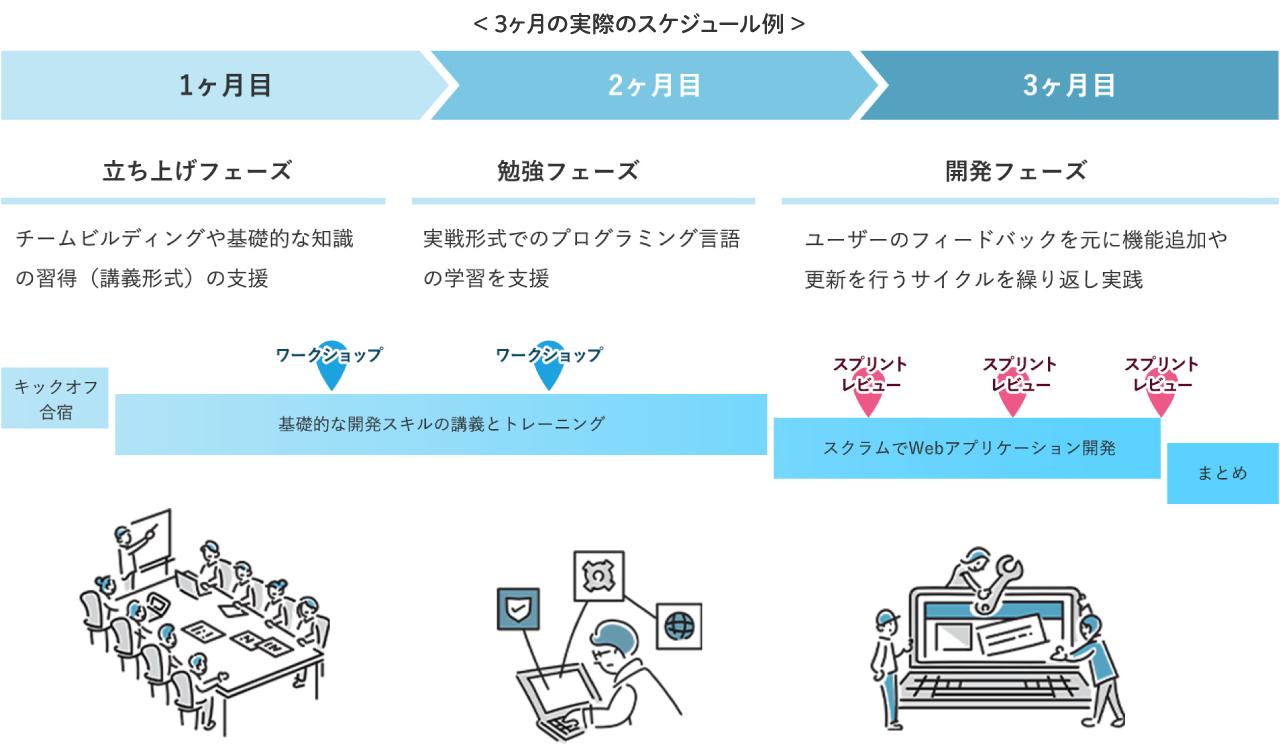 内製化を進めていく上で必要なスキルの習得を伴走型実践的トレーニングとスペシャリストによる短期研修により実現します。