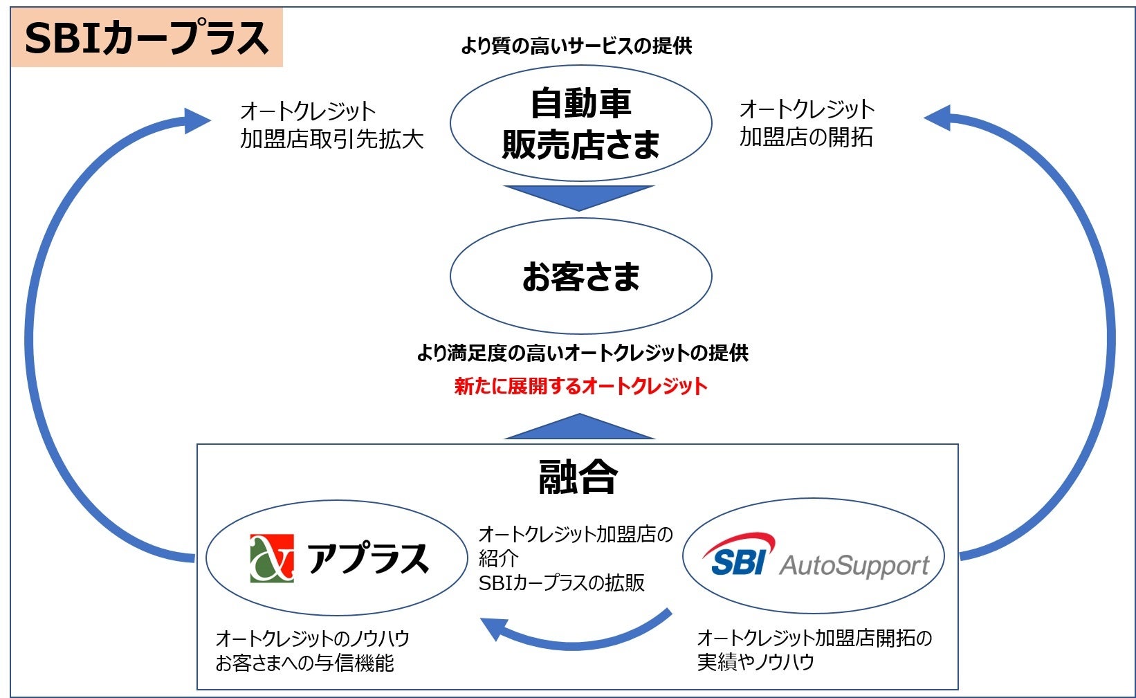 今回提供を開始したオートクレジット「SBIカープラス」は、アプラスが長年のオートクレジット事業で培ってきたノウハウやお客さまへの与信機能と、SBIオートサポートのオートクレジット加盟店開拓の実績やノウハウとの融合により、新たに展開するオートクレジットサービスです。