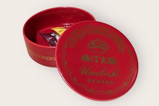 榮太樓總本鋪の定番商品、缶入り「梅ぼ志飴」のお馴染みのデザインはそのままに、ARITA PORCELAIN LABにより、なめらかな陶器に金彩を施した優美な有田焼の容器に仕立てました。見栄えも美しく、末長く使っていただけるサステナブルな商品です。