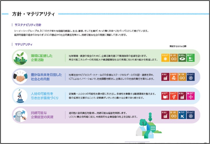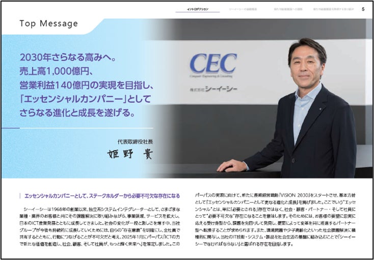 本報告書では、2025年3月に策定した長期経営計画「VISION 2030」と「中期経営計画 2025–2027」を紹介するとともに、シーイーシーが目指す「エッセンシャルカンパニー」の実現に向け、パーパスを起点に資本と事業活動の関係を示す「価値創造プロセス」を提示し、持続可能な経営に不可欠な「マテリアリティとその特定プロセス」なども掲載しています。