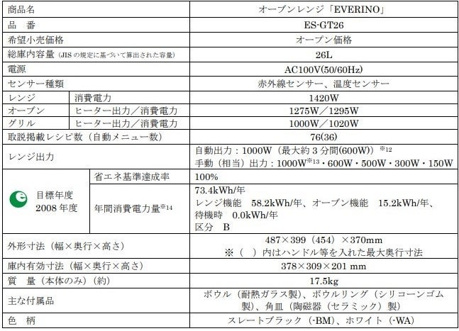 オーブンレンジ「EVERINO(エブリノ)」(ES-GT26型) ニュースリリース