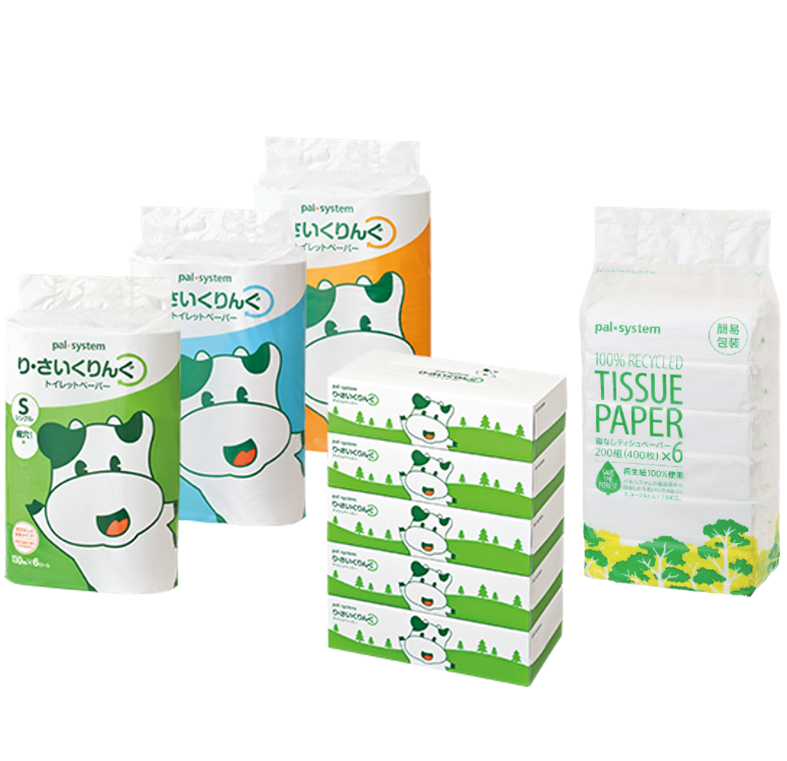 パルシステムオリジナル商品の紙製品は、全て再生紙を採用しています。原料となるのは、宅配で回収する牛乳や飲料、ボディーソープの使用済み紙パックです。使用後は開いて、洗って、乾かすことを利用者に呼びかけ、商品の宅配時にこれらを回収します。回収後は再生紙原料として各工場に運搬され、紙製品へと生まれ変わります。