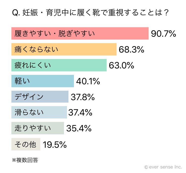 - 妊娠・育児中の靴で重視することは「脱ぎ履きのしやすさ・歩きやすさ」