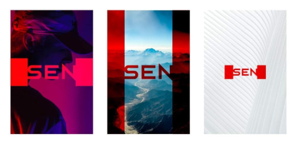 ロゴのグラフィックへの展開として、センラインズは垂直水平に伸ばすことができ、グラフィックと様々な形で融合し、力強さと個性の表現が可能です。また、SENの文字をなくしセンラインズだけで表現することも可能としました。