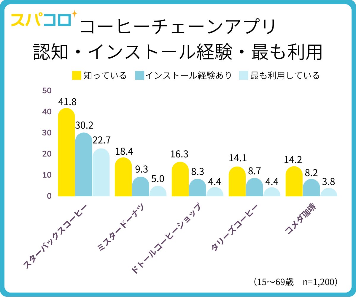 それぞれ認知・インストール経験・最も利用している割合を見ると、認知率は「スターバックス」(41.8%)、「ミスタードーナツ」(18.4%)、「ドトールコーヒー」(16.3%)、「コメダ珈琲」(14.2%)、「タリーズコーヒー」(14.1%)でした。インストール経験は「スターバックス」(30.2%)、「ミスタードーナツ」(9.3%)、「タリーズコーヒー」(8.7%)、「ドトールコーヒー」(8.3%)、「コメダ珈琲」(8.2%)でした。 最も利用率は「スターバックス」(22.7%)、「ミスタードーナツ」(5.0%)、「ドトールコーヒー」(4.4%)、「タリーズコーヒー」(4.3%)、「コメダ珈琲」(3.8%)でした。
