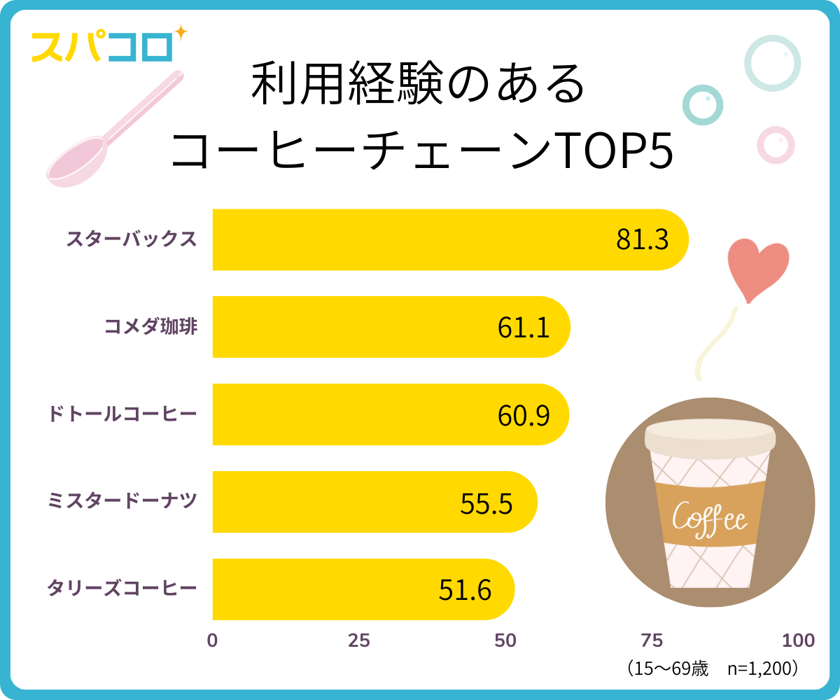 利用経験のあるコーヒーチェーンTOP5は「スターバックス」(81.3%)、「コメダ珈琲」(61.1%)、「ドトールコーヒー」(60.9%)、「ミスタードーナツ」(55.5%)、「タリーズコーヒー」(51.6%)。