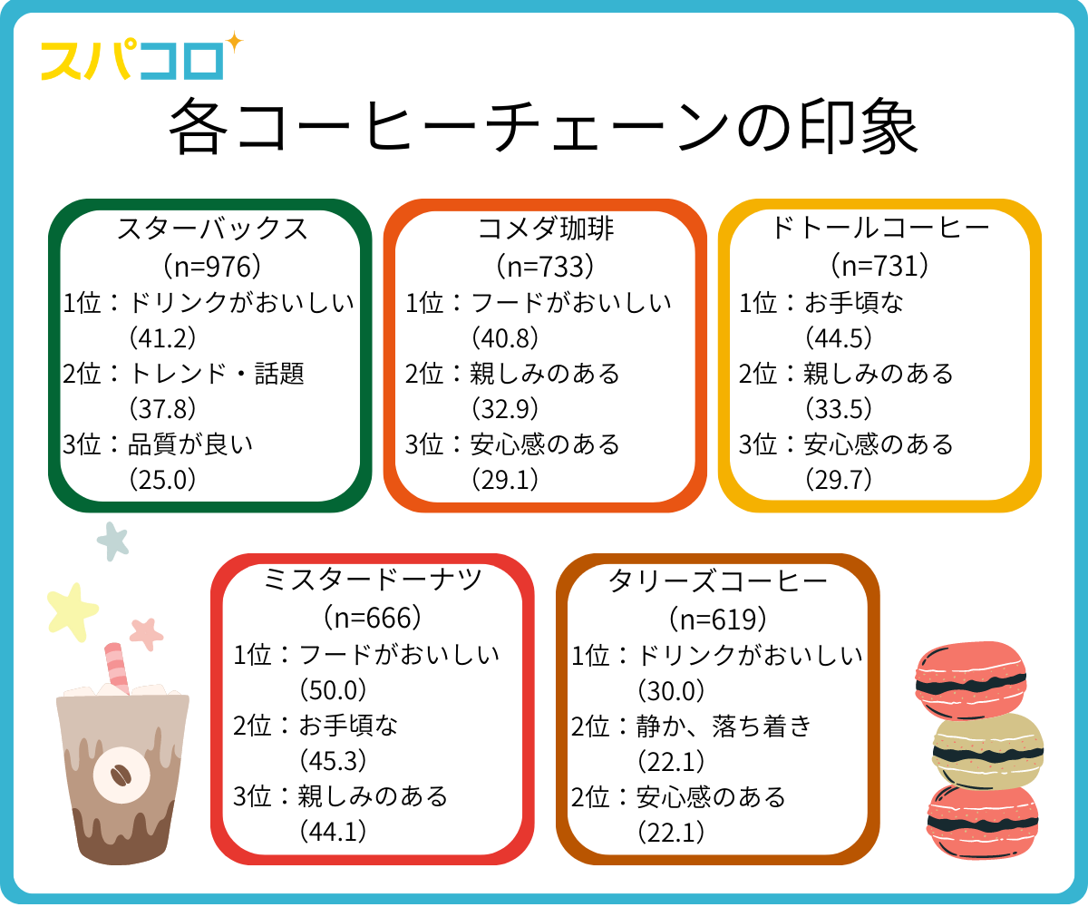 各コーヒーチェーンの印象では、スターバックスは「ドリンクがおいしい」(41.2%)、「トレンド・話題性のある」(37.8%)、「品質が良い」(25.0%)でした。コメダ珈琲は「フードがおいしい」(40.8%)、「親しみのある」(32.9%)、「安心感のある」(29.1%)でした。ドトールコーヒーは「お手頃な」(44.5%)、「親しみのある」(33.5%)、「安心感のある」(29.7%)でした。ミスタードーナツは「フードがおいしい」(50.0%)、「お手頃な」(45.3%)、「親しみのある」(44.1%)でした。タリーズコーヒーは「ドリンクがおいしい」(30.0%)、「静か、落ち着きのある」(22.1%)、「安心感のある」(22.1%)でした。