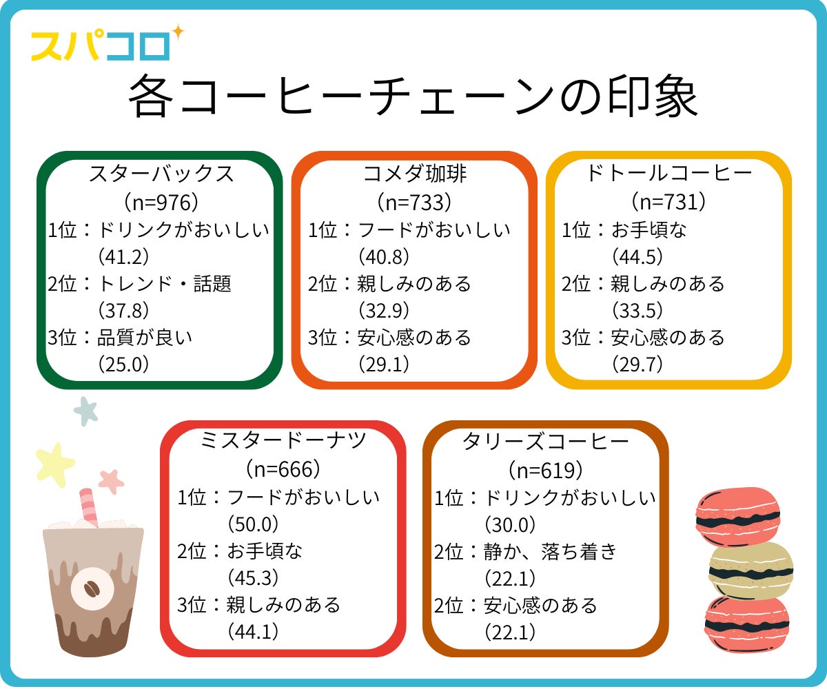 利用経験のあるコーヒーチェーンTOP5は、「スターバックス」(81.3%)、「コメダ珈琲」(61.1%)、「ドトールコーヒー」(60.9%)、「ミスタードーナツ」(55.5%)、「タリーズコーヒー」(51.6%)でした。