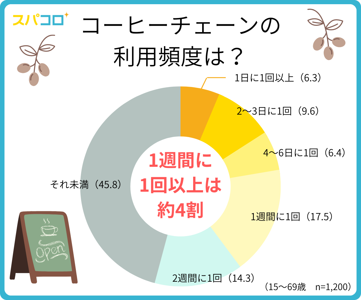 コーヒーチェーンの利用頻度は「1日に1回以上」(6.3%)、「2~3日に1回」(9.6%)、「4~6日に1回」(6.4%)、「1週間に1回」(17.5%)、「2週間に1回」(14.3%)、「それ未満」(45.8%)でした。1週間に1回以上にまとめると39.8%と約4割を占めます。