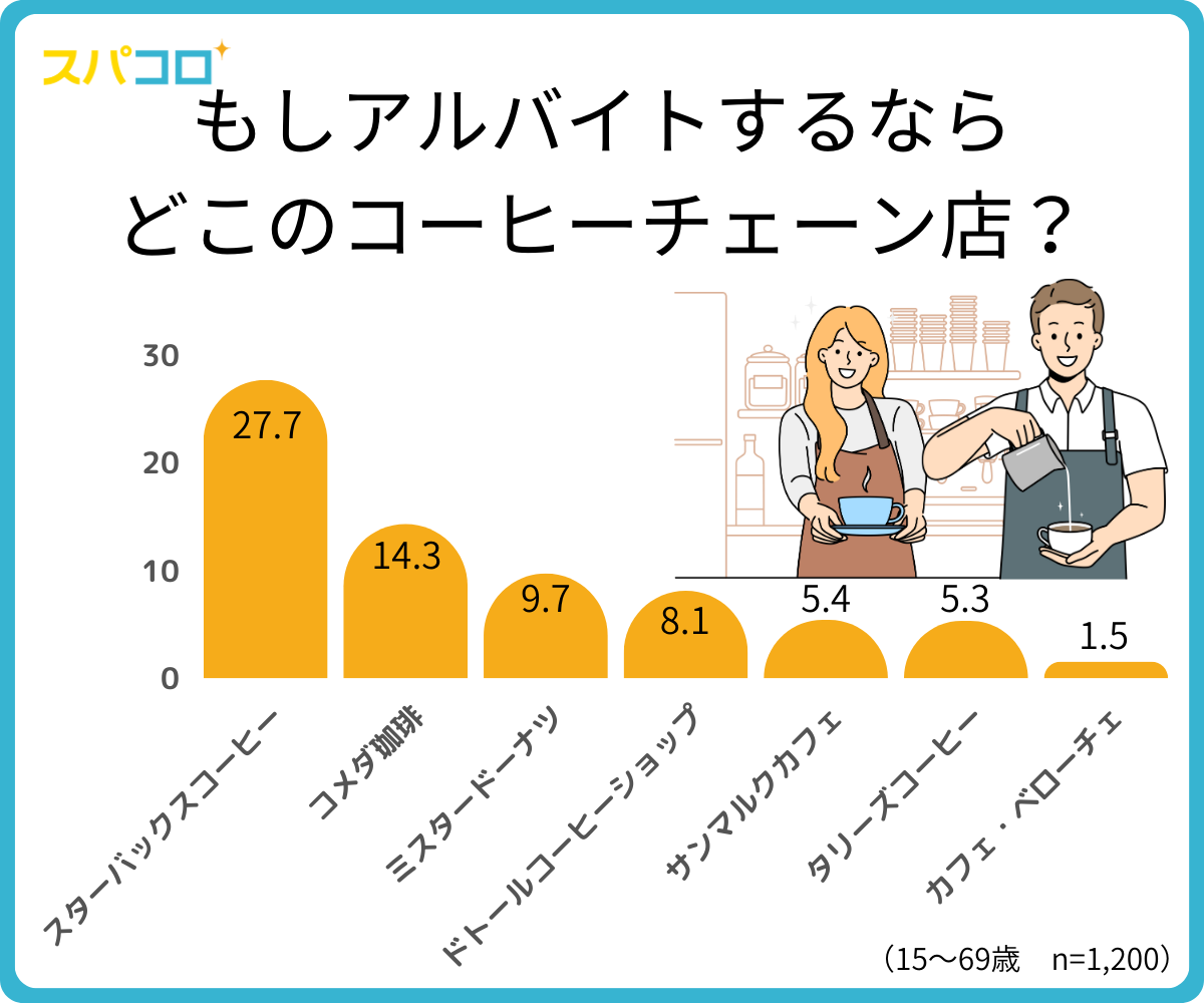 最もアルバイトしたいコーヒーチェーンTOP5は「スターバックスコーヒー」(27.7%)、「コメダ珈琲」(14.3%)、「ミスタードーナツ」(9.7%)、「ドトールコーヒー」(8.1%)、「サンマルクカフェ」(5.4%)。
