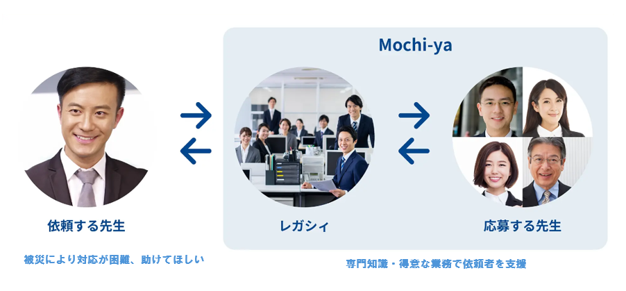 全国7,000事務所とのネットワークを持つ強みを活かし、士業のためのマッチングプラットフォームである「Mochi-ya」をベースに、被災地現地で顧問先や地域の支援を必要とする士業事務所と、現地を支援したい士業事務所を迅速につなぎ、緊急的な被災地への支援を実行します。