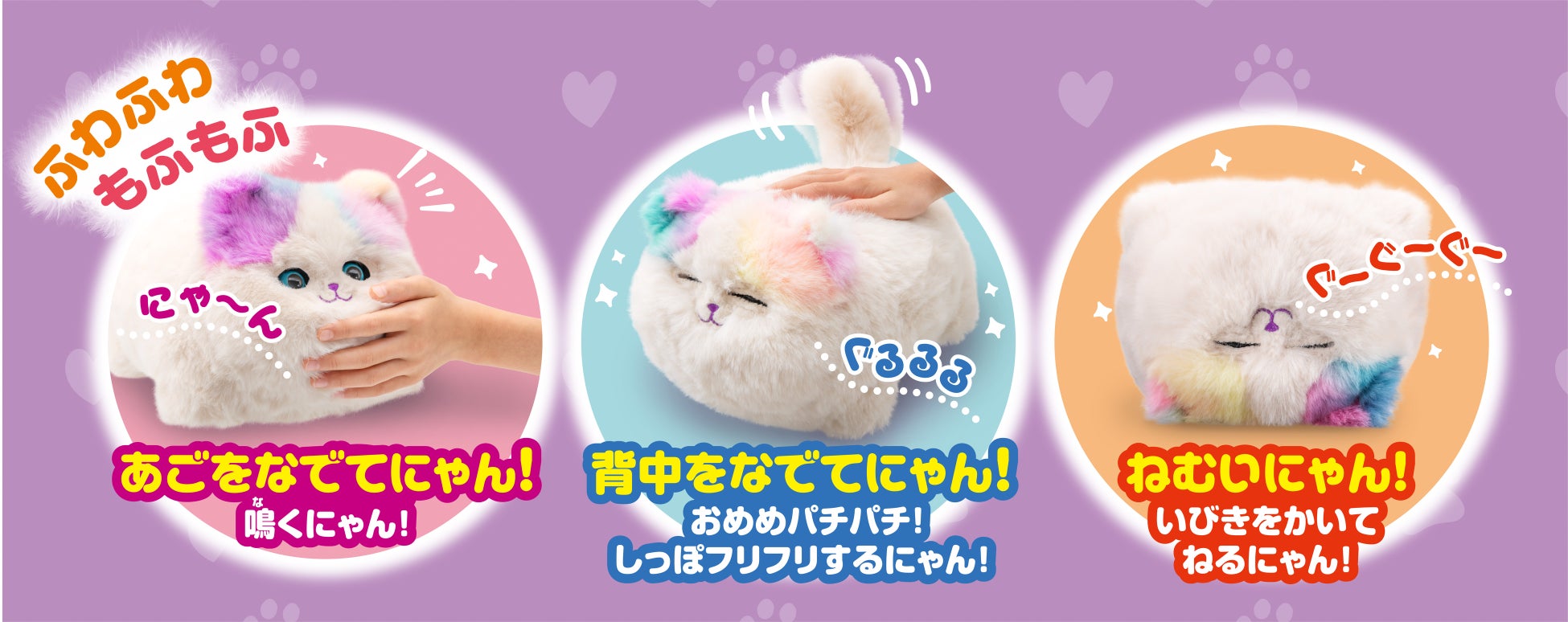 「ニャンだきみは!?」は、あごや背中をなでてあげるとしっぽを振ったり、仰向けに寝かせるといびきをかいたりと、豊かなリアクションが特徴の猫型コミュニケーショントイです。また話しをかけると、真似をしてくれます。ふわふわとした手ざわりで抱き心地も良く、癒しの要素も備わった商品です。外見は白を基調としながらも、耳の色が個体ごとに異なっているため、自分だけの愛猫を可愛がることができます。