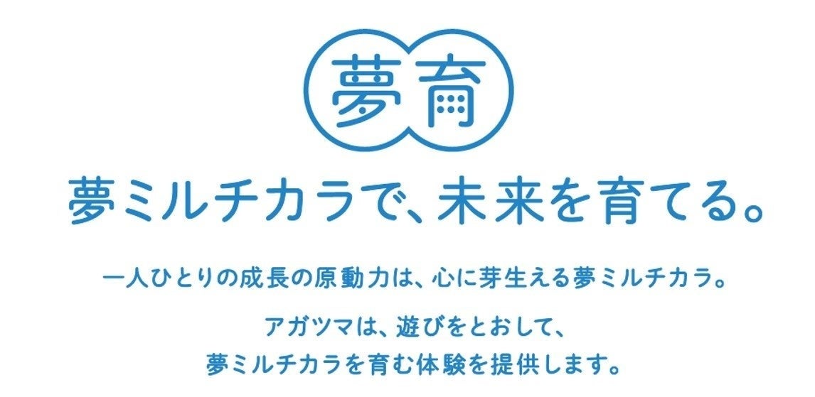 株式会社「アガツマ』は、“夢ミルチカラで、未来を育てる。”をテーマとした「夢育』を新たな企業理念として掲げています。遊びをとおして、「安心のために』、「みんなのために』、「地域のために』、3つの「夢育』アクションをはじめています。