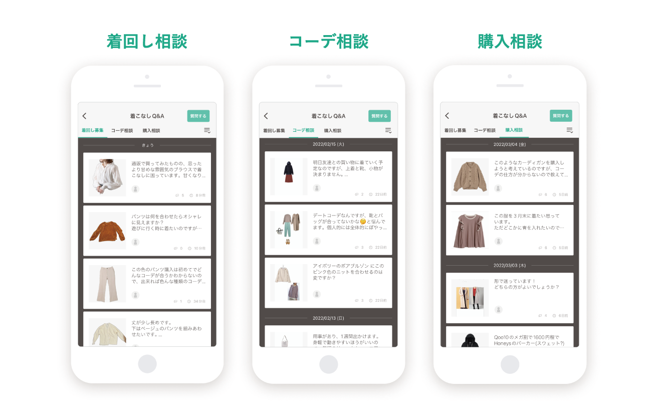 「購入したもののどう着こなしたらいいか分からない」といった相談では、クローゼットの奥で眠っている服や、春に向けて買ったものの着こなし方が分からない服に対し、一軍アイテムとして活躍させるためのアイデアが寄せられていました。また、「購入相談」のコーナーにおいては、春に向けて購入を検討しているアイテムの着こなし方を相談し、着回しができそうか事前に確認している投稿が多く目立ちました。