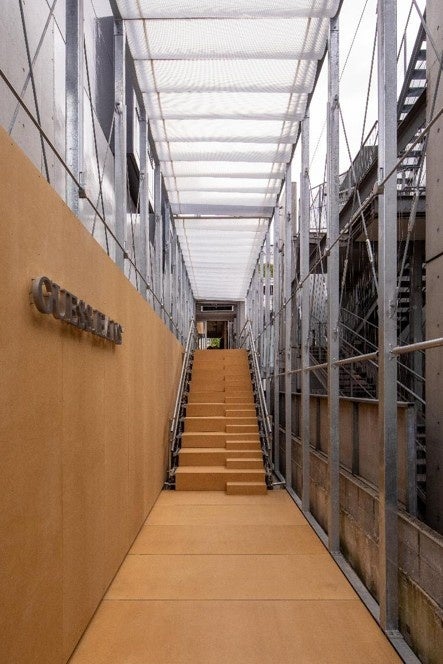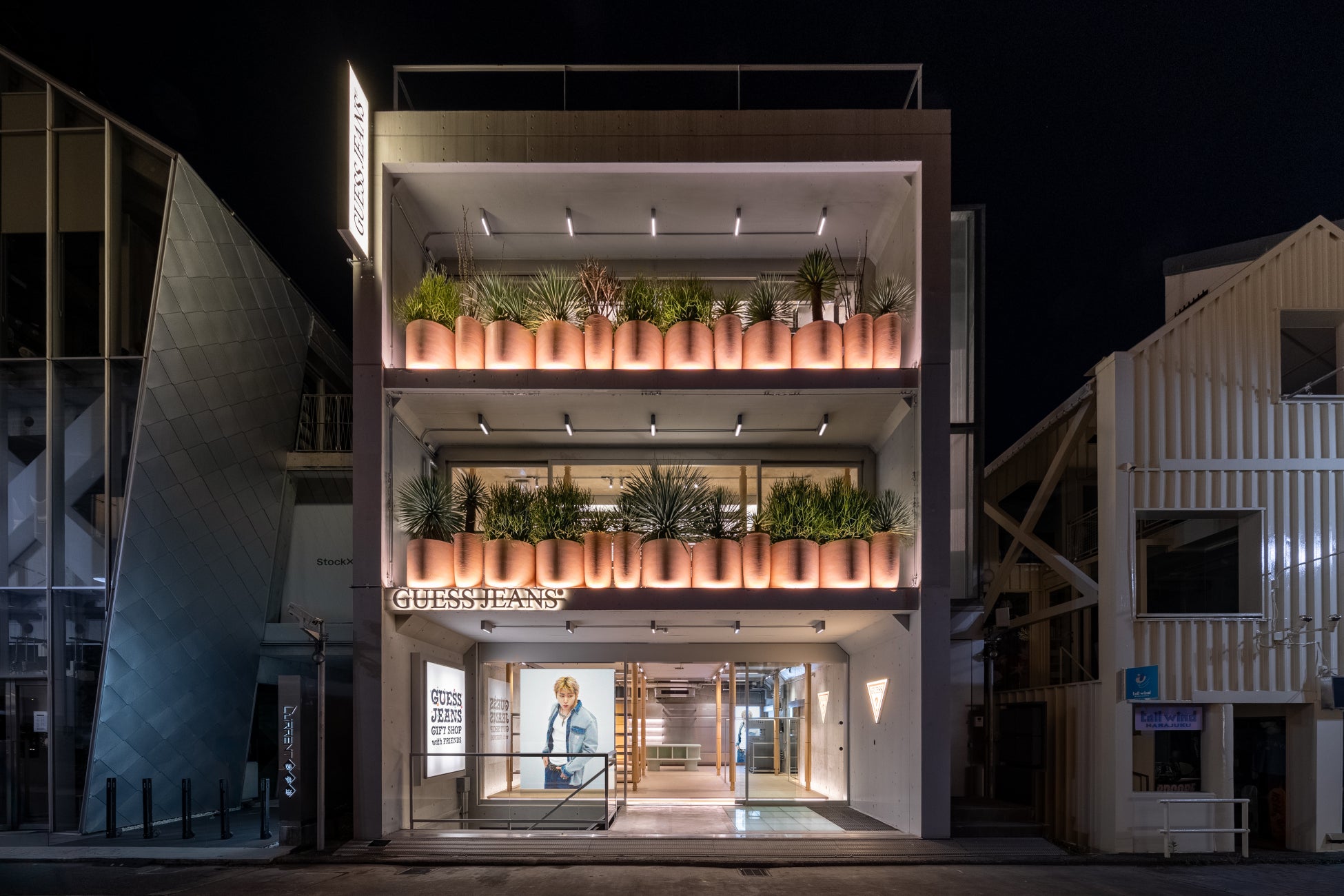 4フロアからなる店内は、「GUESS」の原点である南カリフォルニアの自然と日本のクラフトマンシップと建築文化を融合させたデザインで、建築や素材、植栽に至る細部まで「GUESS JEANS」の美学を浸透させた空間となっています。外観は、ミニマルなコンクリートで構成され、そこに「GUESS JEANS」がキュレーションする多彩なプロダクトやカルチャー、地域コミュニティを包み込む“器”をコンセプトに設計。