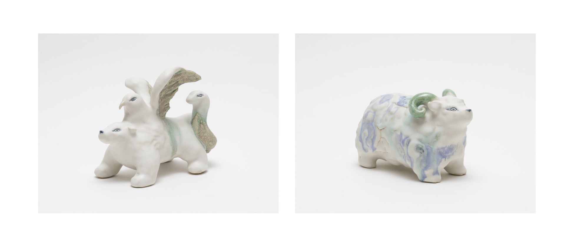 丸みのある造形で表現された架空の動物たちは、静かで凛とした表情と共に今にも動き出しそうな躍動感を秘めています。