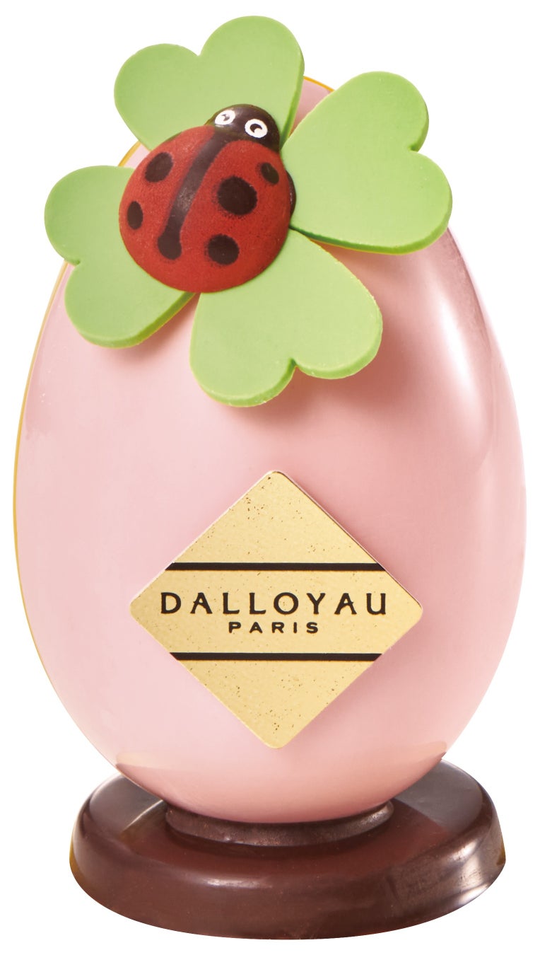 ・ピンクと黄色に色付けしたホワイトチョコレートで卵型に仕立てたショコラ。卵を割ると中からフリチュール(海のいきものの形をしたショコラ)が2個出てくる仕掛け付き!