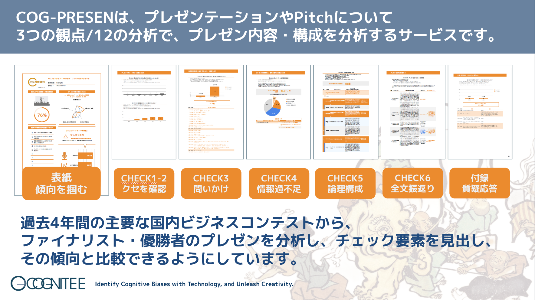 コグニティは、最終審査での最終Pitchについても同様に分析を行い、今回のフィードバック前後の変化を“成長度”として可視化するほか、過去受賞者との傾向比較(受賞水準に近づいた点/まだ残るギャップ)を提示することで、最終局面の改善精度を高めます。