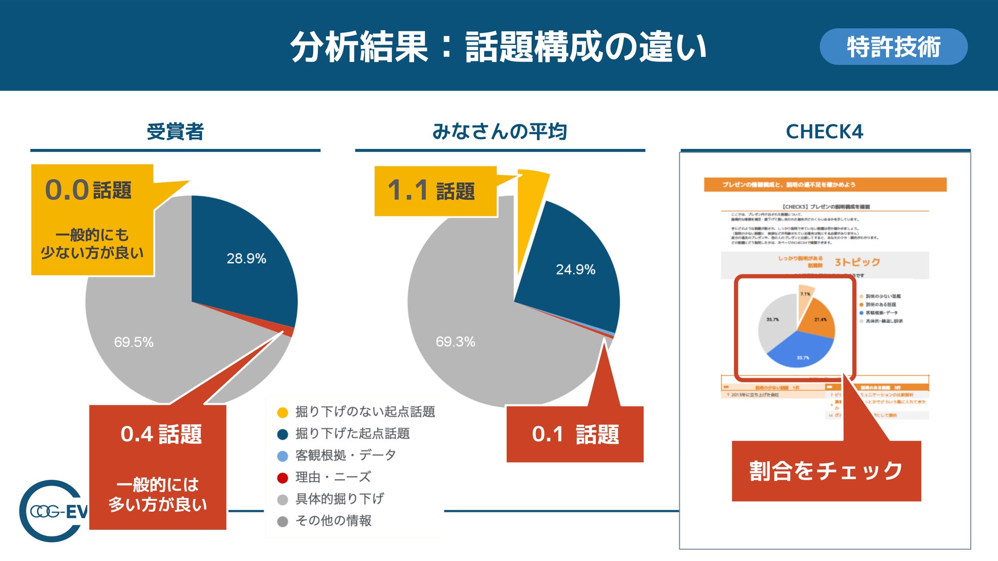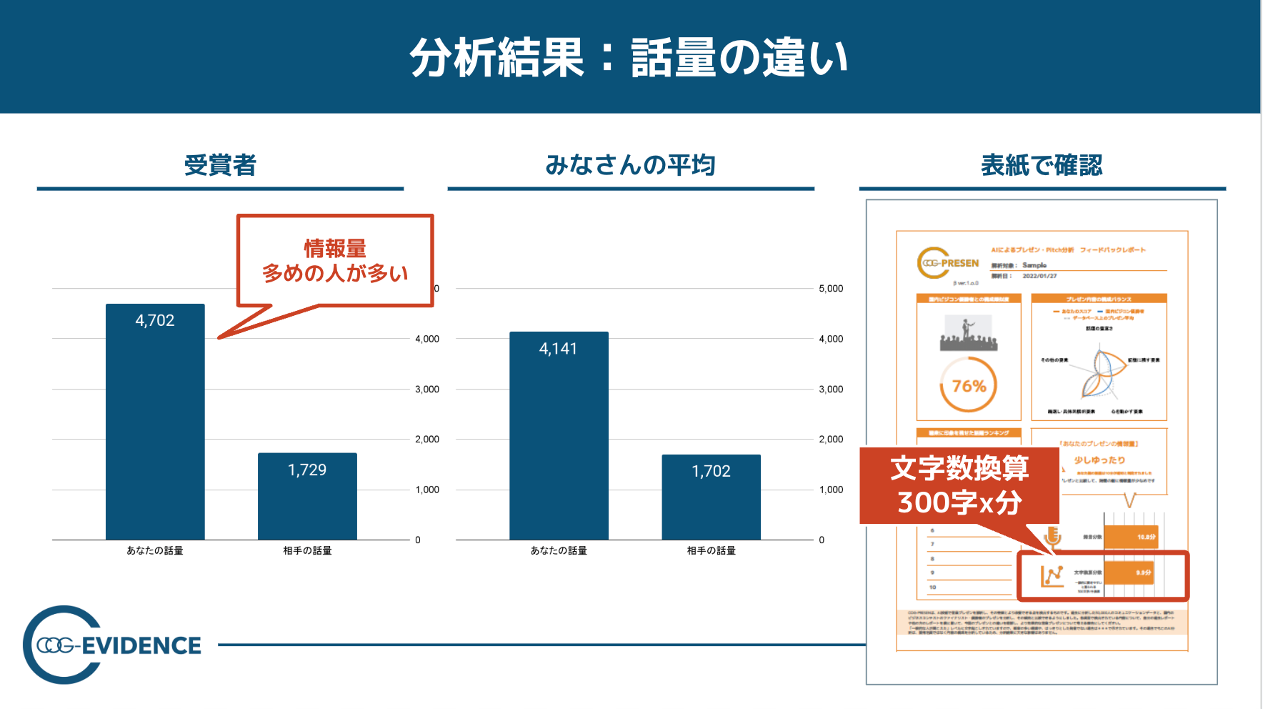 例として、情報量(総発話量)では受賞者側が多く、ファイナリスト側は「もっと語るべき論点が残っている可能性」を示唆。加えて、スピード(1分間あたりの文字数)は大きく変わらないにもかかわらず情報量が少ないことから、「早口だから短い」のではなく「内容がまだ詰め切れていない」可能性を示しました。