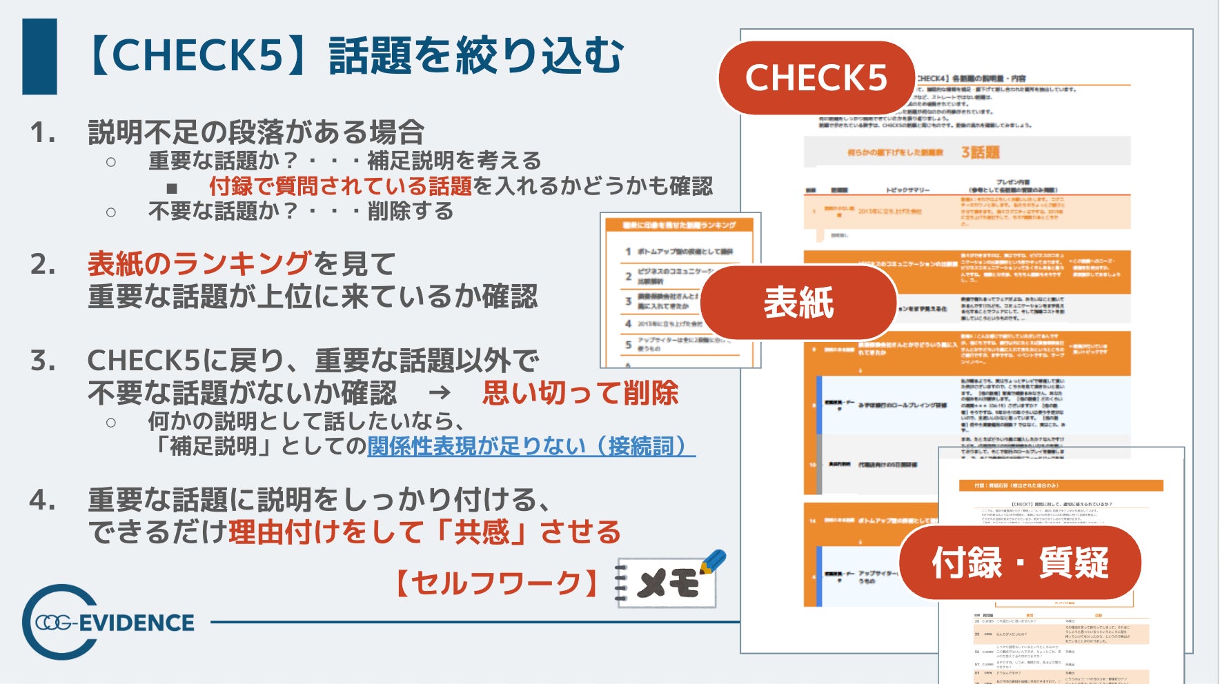 セルフワークは各自レポートのCHECK項目を使い、改善対象の段落・追加すべき根拠・削る話題を棚卸しするなど、レポート上の分析表示から具体的な改善に取り組んでもらいました。それにより、各参加者は自身のPitch内話題の優先順位を再考、取捨選択を実行しました。