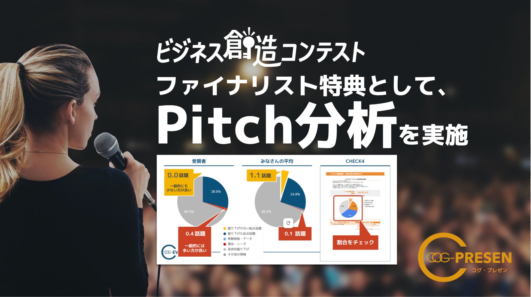 本施策では、ファイナリストのPitch(発話内容)を対象に定量化し、“説明不足の話題・情報の種類”や、「えー」「あのー」といった“伝わり方のクセ”を抽出することで、改善の優先度を明確化。過去受賞者(昨年度の最優秀賞・優秀賞・奨励賞)との比較により、受賞水準に対するギャップを具体的に提示しました。