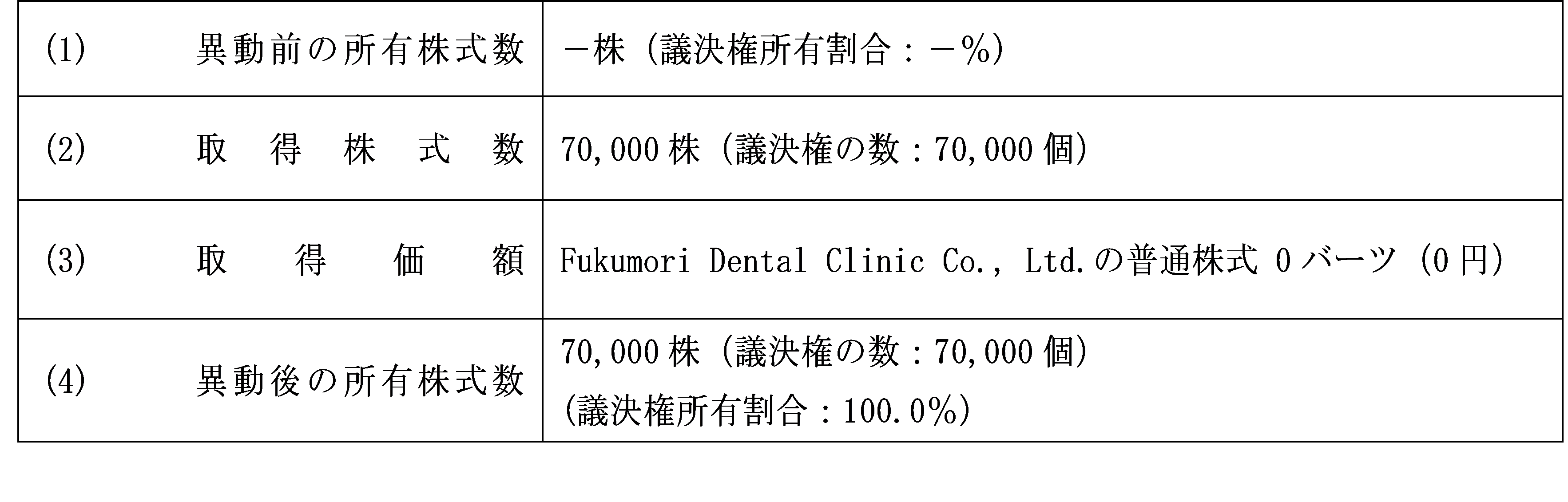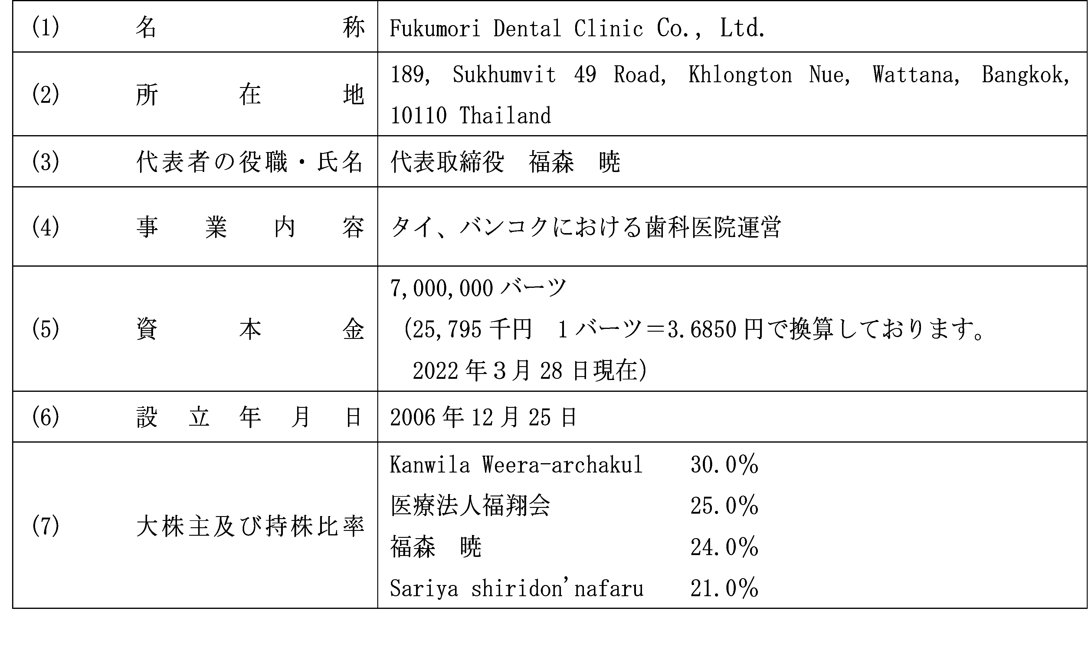 3.異動する子会社(Fukumori Dental Clinic Co., Ltd.)の概要