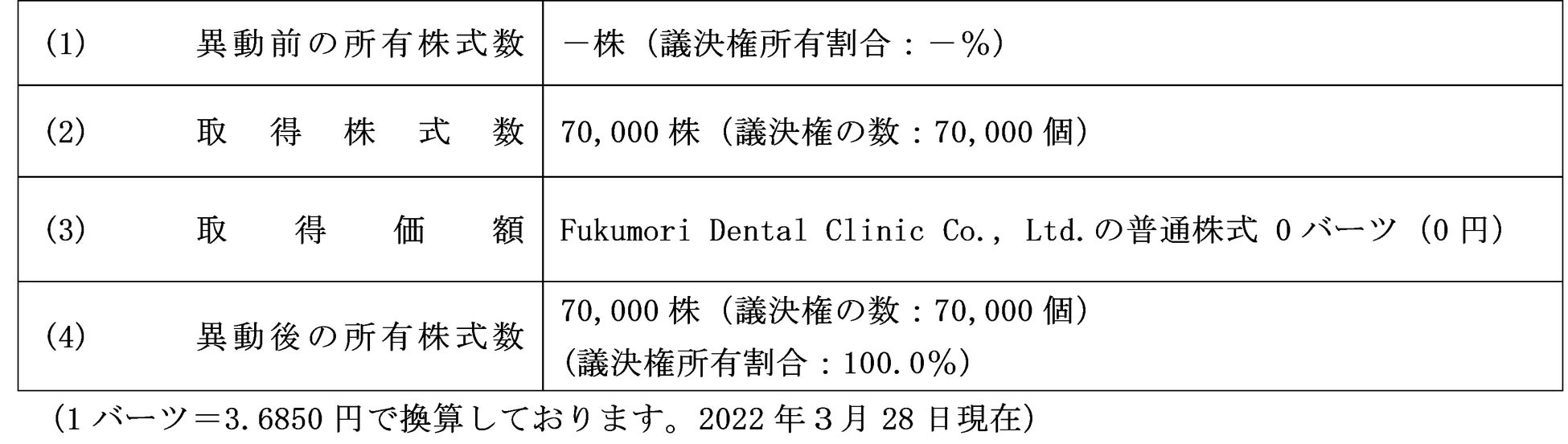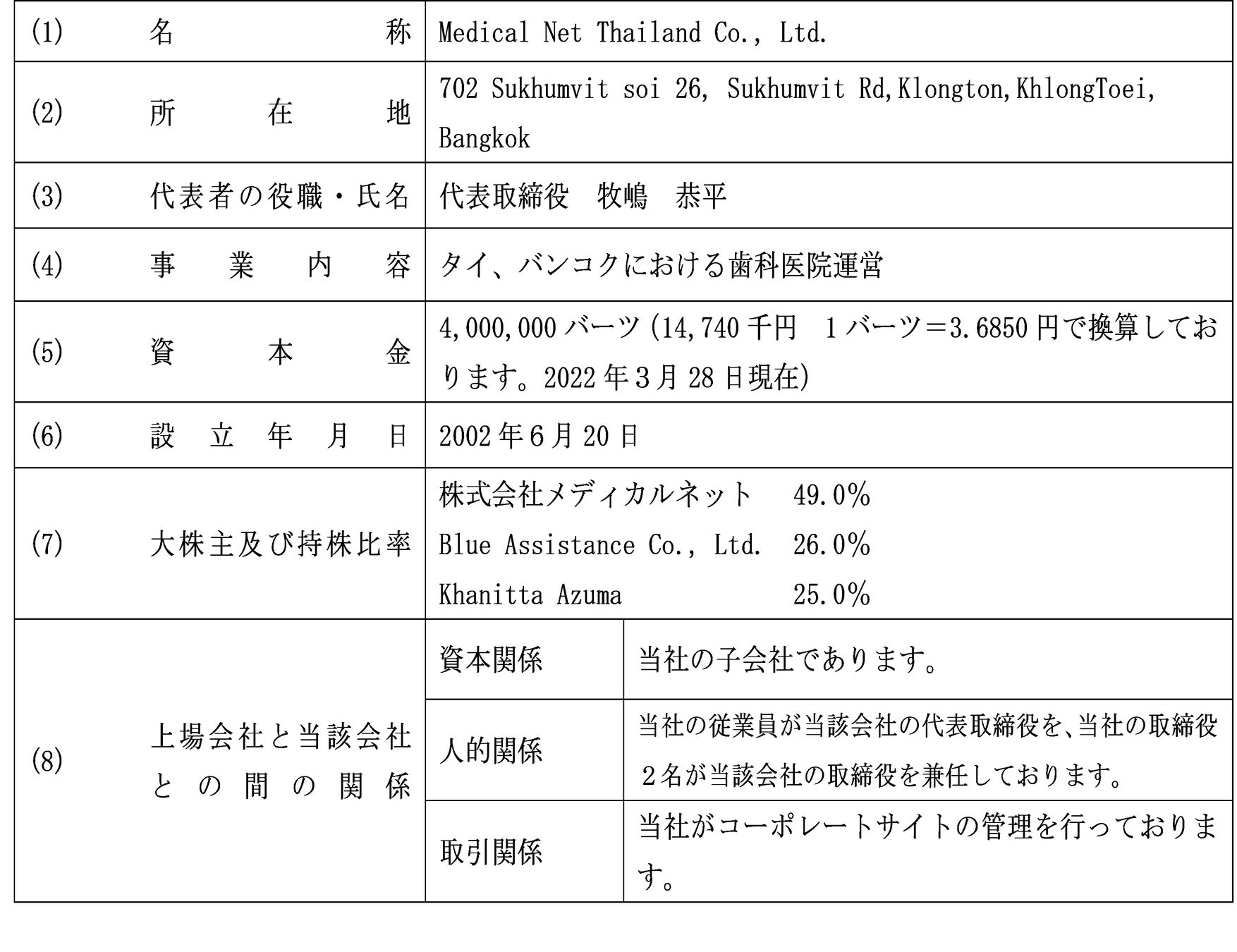 当社は、2022年3月30日開催の取締役会において、以下のとおり、Fukumori Dental Clinic Co., Ltd.(以下、「FDC社」)の発行済株式の全株式を当社の連結子会社であるMedical Net Thailand Co., Ltd.(以下、「MNT社」)を通じて取得することを決議いたしました。なお、本件によりFDC社は連結子会社(孫会社)となることをお知らせいたします。