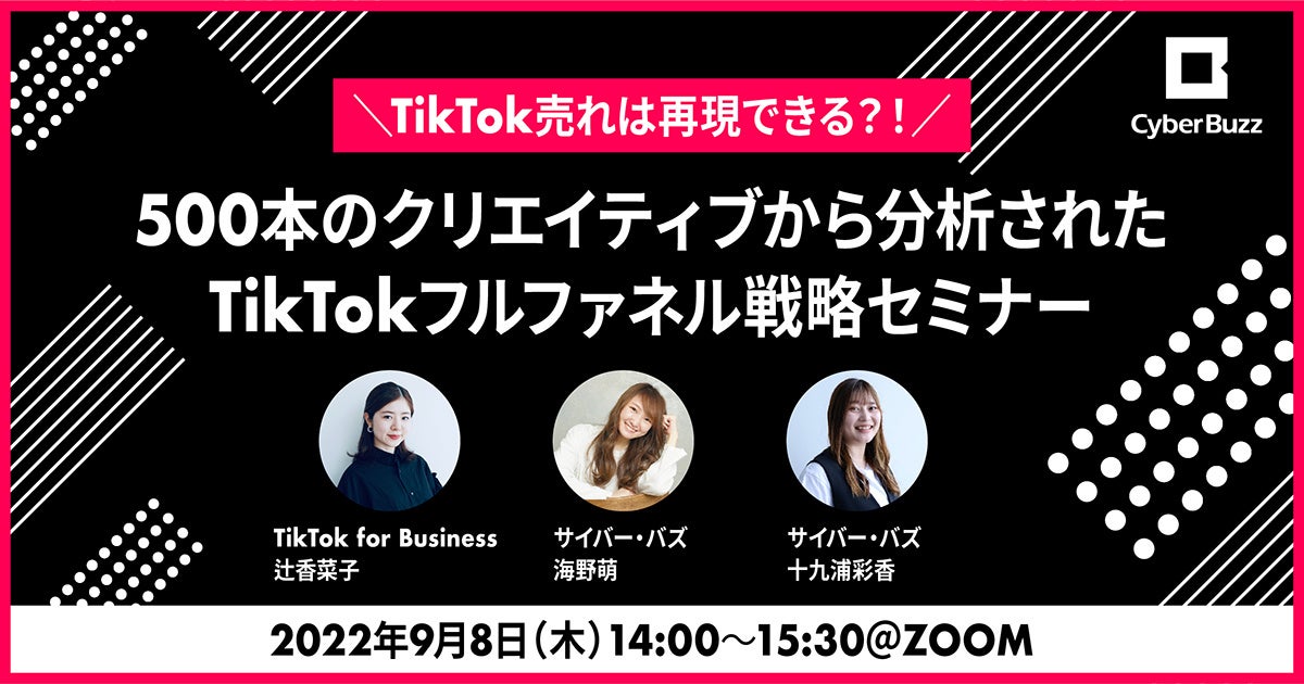 ソーシャルメディアマーケティング事業を展開する株式会社サイバー・バズ(本社:東京都渋谷区、代表取締役社長:髙村彰典)は、ゲストスピーカーとしてTikTok for BusinessでTikTokプロモーションの提案を行っている辻香菜子氏をお招きし、ウェビナー「TikTok売れは再現できる!?500本のクリエイティブから分析されたTikTokフルファネル戦略セミナー」を9月8日(木)に開催いたします。