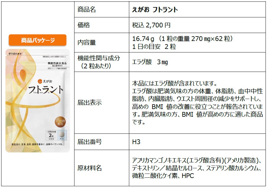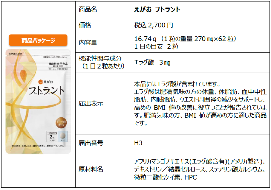 そこでこの度、BMI値が高めの方※1の腹部の脂肪減少をサポートする機能性関与成分、アフリカマンゴノキ※2由来のエラグ酸を配合した新商品「えがお フトラント」を開発しました。