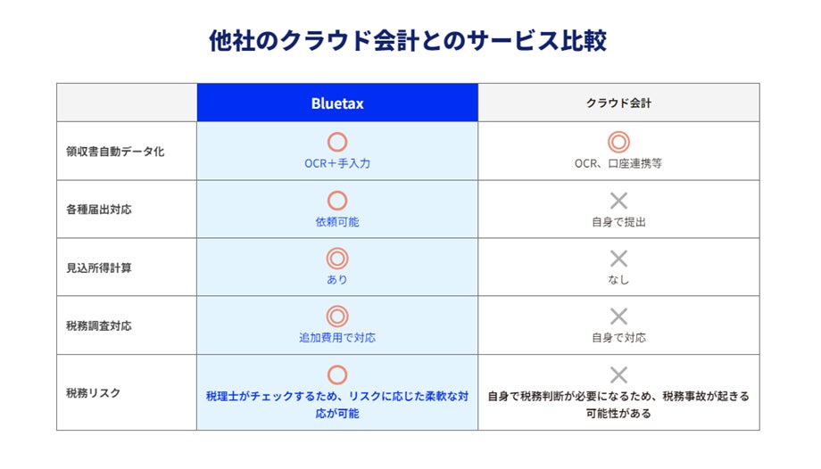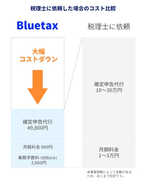 今回当社が提供を開始する「Bluetax(ブルータックス)」は、スマホから操作できるクラウド会計ソフトの利便性に加え、常時LINEで税理士に相談できる安心のサポート体制が担保されながらも、税理士に依頼するよりも大幅にコストを抑えることができます。