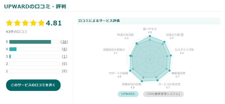画像引用:「BOXIL SaaS」UPWARDの口コミ・評判 ※2022/03/01時点の評価