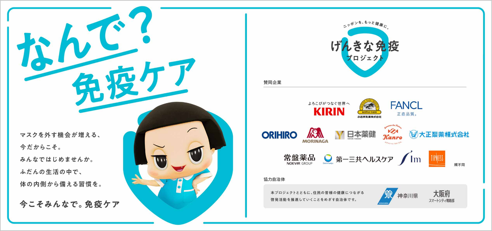 本プロジェクトは、国民的人気者であるNHK「チコちゃん」が、免疫ケアのテーマカラーである水色の衣装となって応援するほか、キリンや森永製菓、そして日本薬健など、全13社が取り組みを推進します。