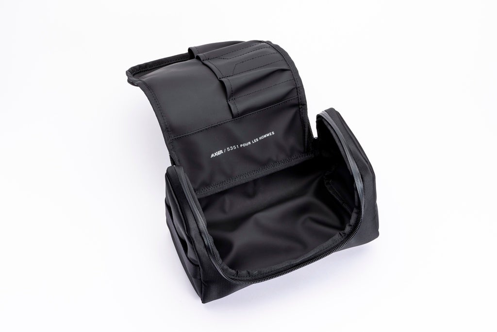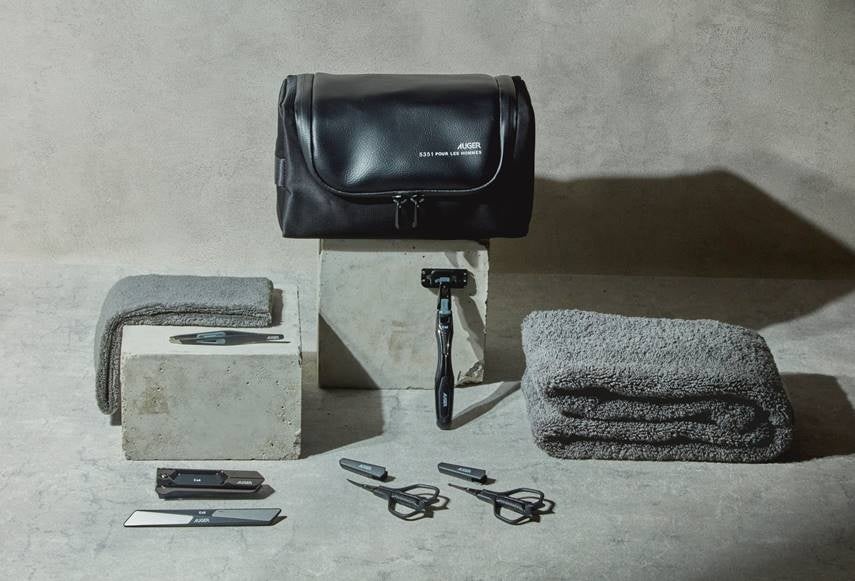 オリジナルポーチ付き限定セットには、「AUGER」ブランドのシステムカミソリ、ツメキリM Revolver、ネイルファイル、オシャレハサミ、セーフティハサミ、毛抜き、ヘアバンド、タオルがラインナップ。それらを全て収納できる「5351POUR LES HOMMES」のオリジナルポーチを含む計9アイテムがセットになったプレミアムな限定商品です。ご自宅でのフェイス、ボディのお手入れのほかに、外出時や旅先にもこのポーチ一つで身だしなみを整えることができます。