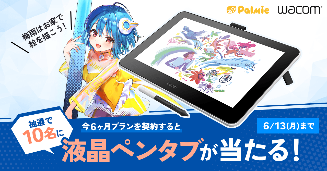 株式会社パルミー(所在地:東京都港区、代表取締役:伊藤貴広、以下パルミー)は、本日2022年5月23日(月)14時00分〜2022年6月13日(月)23時59分の期間中に月謝制6ヶ月プランを契約されている方を対象に、抽選で10名様にWacomの液晶ペンタブレットをプレゼントするキャンペーンを開催いたします。