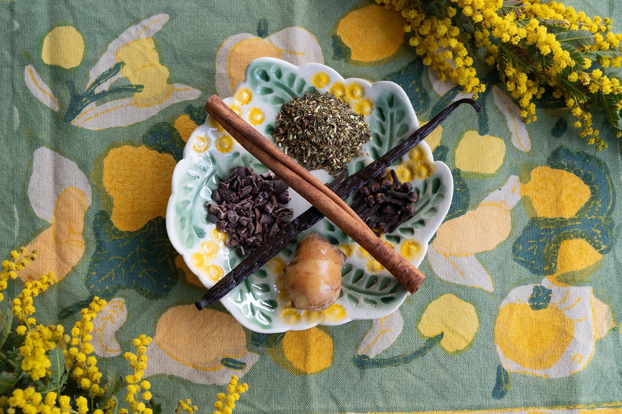 マダムヒロミ x Tea Bird Tea国際女性デーに寄せて、マダムヒロミがブレンドした特別なルイボスティー。グリーンルイボスとカカオニブのやわらかな土台に、シナモン、クローブ、生姜、バニラを重ねました。カカオとバニラのほのかな甘さと、スパイスの温もり。それはまるで、春を告げるミモザの花のように、優しく心を照らす一杯です。