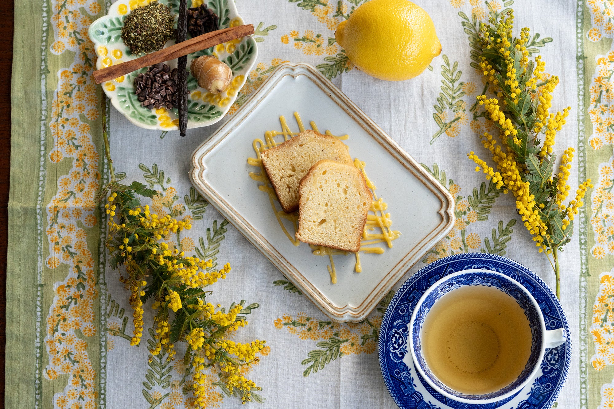 お花のミモザをイメージしたトッピングにもレモンケーキを使用しています。レモンカードを花びらに見立てて、美味しさはもちろんのこと、可愛らしさを追及しました。