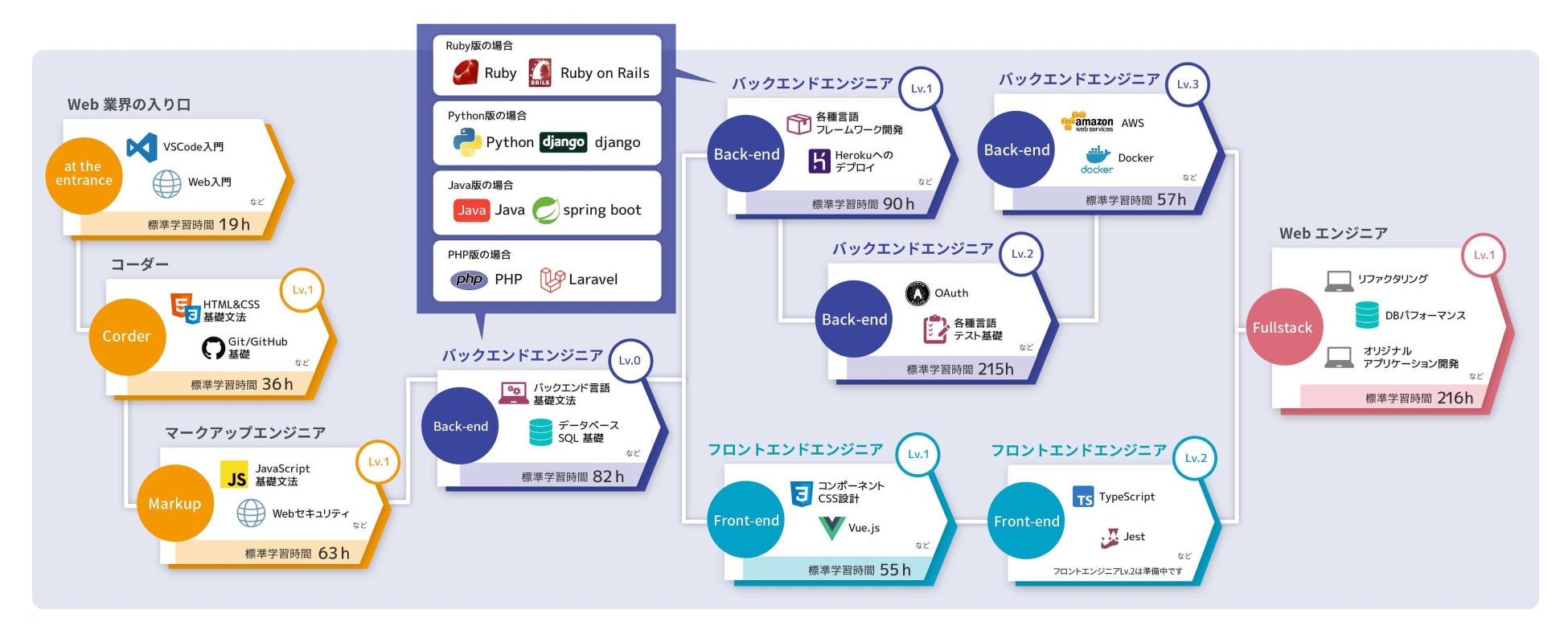 Webエンジニア職を目指したい方が、具体的な業務内容や未来の自分の姿をイメージしながら、自分が身につけるべきスキルをロードマップに沿って学習・習得できるコースとなっています。