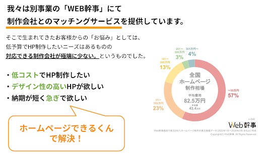 その中で、課題になったのが「低予算のホームページ」。中小企業は予算が限られている中で、可能な限り安くホームページを作りたい。一方でホームページを作る制作会社は、一定以上の予算が見込めないと、案件の対応が難しくなる。低価格帯のホームページ制作は、明確に需要と供給のバランスが不一致な課題がありました。