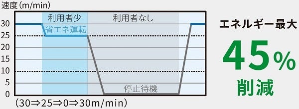 インバーター制御により利用者が少ない場合、運転速度を通常の30m/minから25m/minに減速させて消費電力を削減します。また、利用者がいない状況ではエスカレーターを自動で停止させます。インバーター制御が無いタイプのエスカレーターの通常運転と比べ、最大45%の省エネ効果*2を実現します。