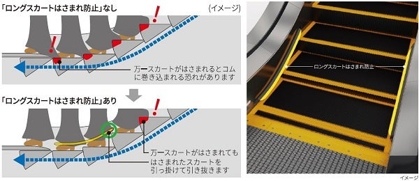 「ロングスカートはさまれ防止」機能は、ロングスカートなど丈の長い衣類やサンダルが、エスカレーターの踏段と、スカートガードパネルの間に巻き込まれたり、はさまれたりする事故を防止する効果があります。当該機能はエスカレーターの乗降口、下段部の左右のスカートガードに設置されます。