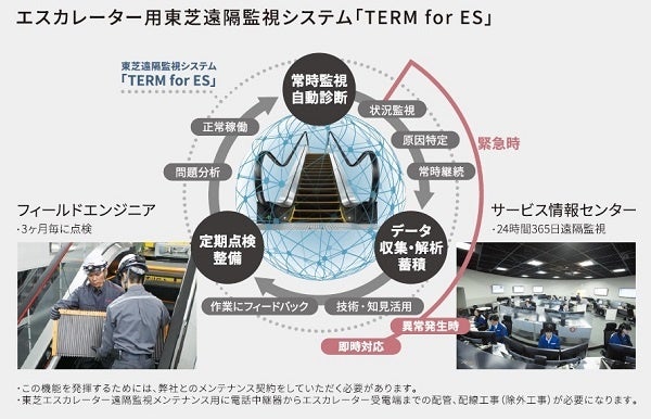 新たに開発したエスカレーター専用の遠隔監視システム、「TERM for ES」の適用を開始しました。エスカレーター内にセンサーと通信機器を設置することにより、エスカレーターが運行状態中でも自動で診断を行い、診断結果を弊社内にある監視センターに送信することで、チェーンの異常予兆など、機器の状態を遠隔で把握することが可能となります。本システムの導入により、品質の維持や、より適切なタイミングでの機器の調整、交換ができるよう、保守サービスの更なる向上を目指します。