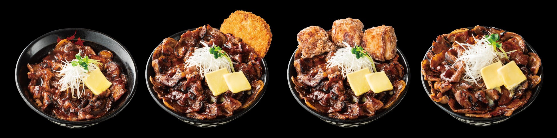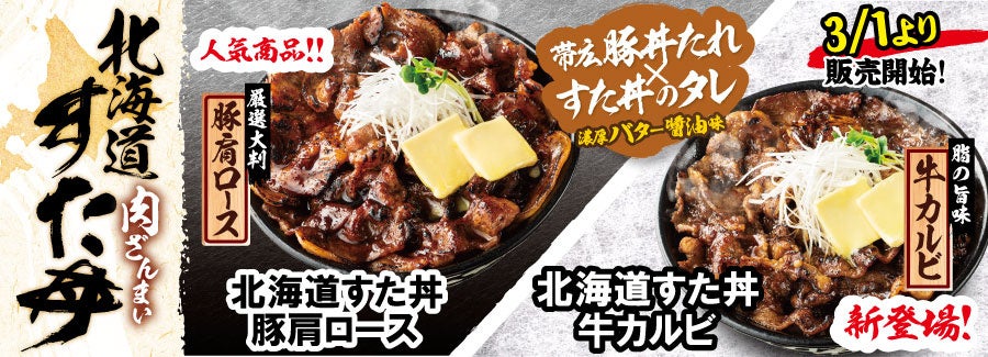 肉量も従来の約150gから30g増量し約180gに。『肉ざんまい 北海道すた丼 牛カルビ×豚肩ロース』に関しては約240gとなり『北海道すた丼』史上最大のボリュームとなっております。是非この機会に、旨さもボリュームも超進化した『北海道すた丼』をご堪能ください!