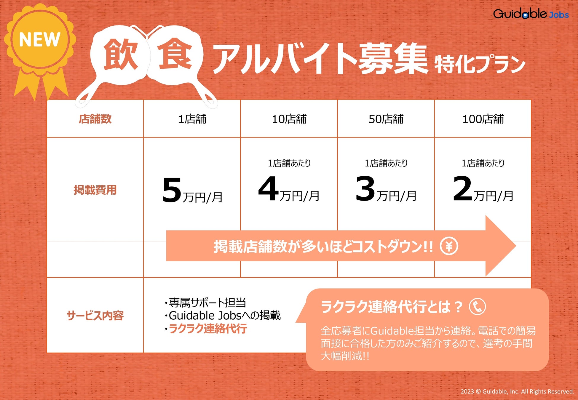 現在、飲食店はアフターコロナにおける急激な需要回復で活況を呈する一方で、日本人アルバイトのなり手不足による人手不足が顕在化しています。本プランでは、中堅〜大規模事業者に向けて、店舗数に応じた1店舗あたり掲載コストの割引も実施しており、人手不足に対する切り札としてご利用いただけます。詳細はGuidable Jobs お問い合わせページ ( https://guidablejobs.jp/contact/ )より、お問い合わせください。
