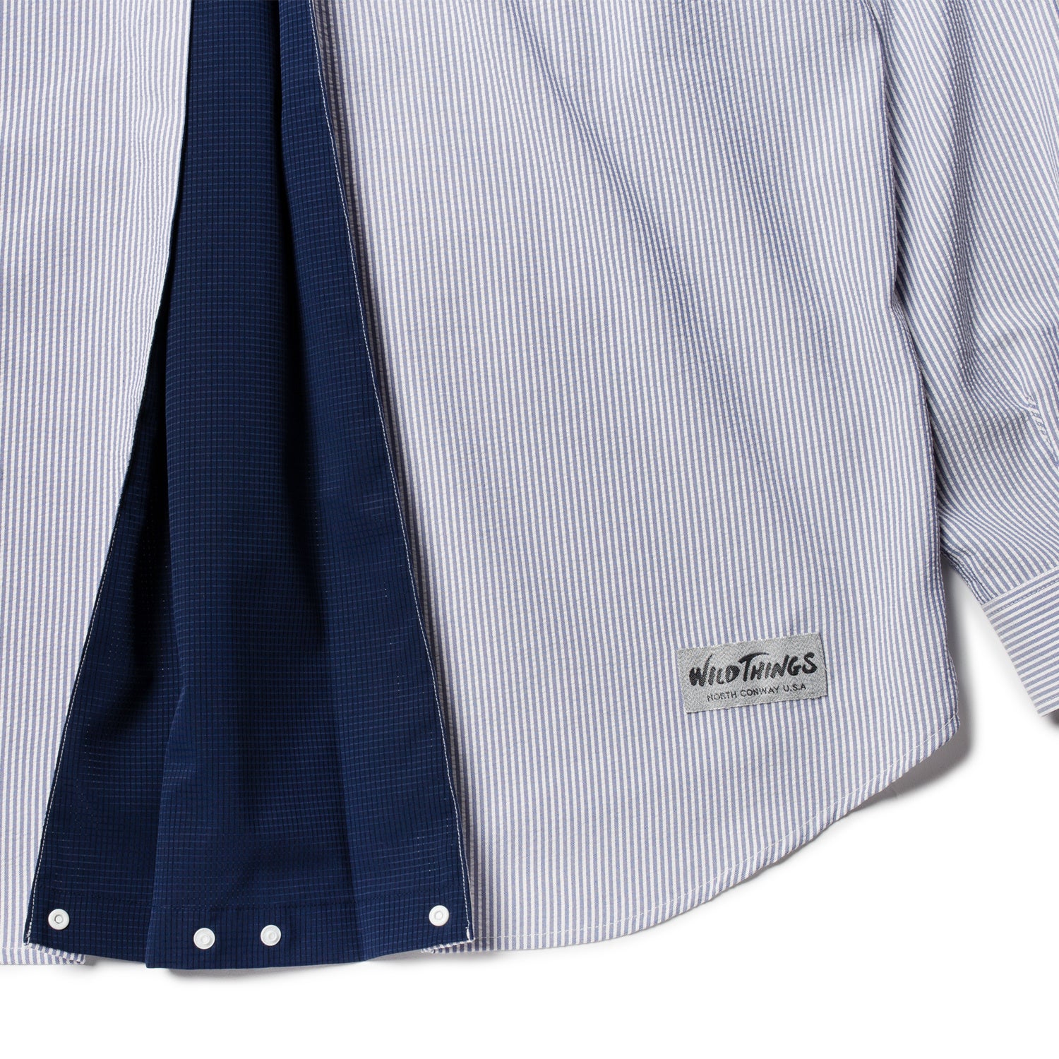 表地にはポリエステルストレッチサッカーストライプを採用。ポリエステル 100%でありながら、スパンライクな表情のサッカー生地は、 軽量、吸水速乾、イージーケア性があり、シャツの悩みである洗濯後のシワ問題も軽減。ストレッチ性もあるため、通常のシャツに比べ自転車乗車時の動きを制限する事がなく、ベースのDENALI SHIRT自体が収納力のあるフロントポケットを完備しているため、このコラボレーションシャツではナリフリらいし自転車に乗るための機能をプラスしました。全てのボタンは片手でも着脱しやすい様にドットボタンを使用。体温上昇の激しい自転車乗りの事を考慮し、ムレ防止の為に背面にnarifuri独自のベンチレーションシステムを採用しています。脇下にはハトメ仕様を追加し、WILD THINGSの特別仕様のリフレクターネームも付属します。